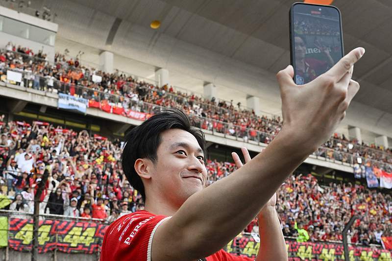 周冠宇在2025年中国大奖赛赛场上和车迷们自拍(图自视觉中国)